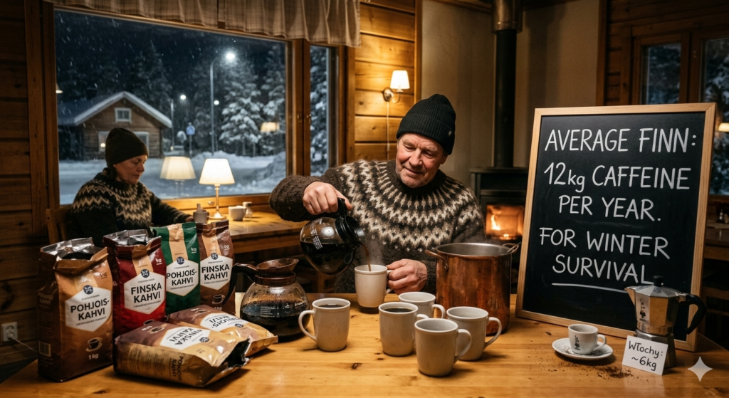 Jeśli zapytasz kogoś na ulicy, jaki naród pije najwięcej kawy, 9 na 10 osób w ciemno obstawi Włochów. Błąd! Prawdziwymi królami kofeiny są mieszkańcy Finlandii. Przeciętny Fin spożywa około 12 kilogramów kawy rocznie (dla porównania, w Polsce to około 3-4 kg, a we Włoszech ok. 6 kg). Zimno, ciemno przez pół roku – nic dziwnego, że ratują się litrami gorącego, czarnego naparu.