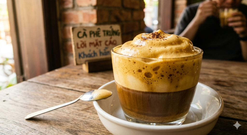 Wietnamska kawa jajeczna (Cà Phê Trứng): Zamiast zwykłego mleka, na wierzch trafia gęsta, słodka piana z ubitych żółtek i skondensowanego mleka. Brzmi dziwnie, ale smakuje jak płynne, gorące tiramisu!